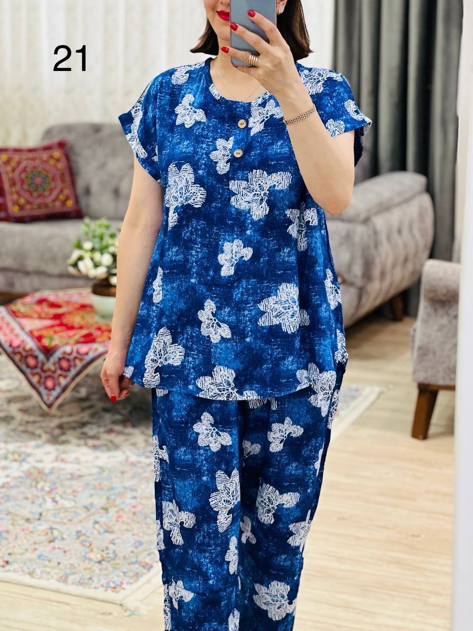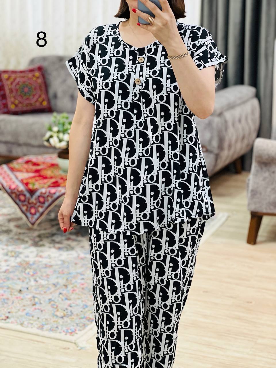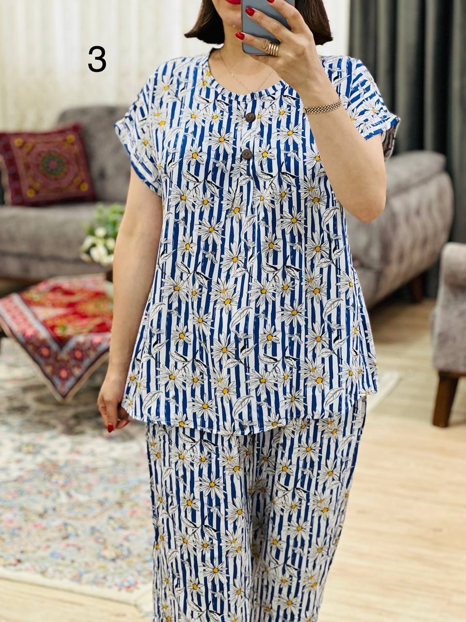 مناسب 40 تا 44 / دور سینه 120 / قد تیشرت 70 / قد آستین از یقه 23 / قد شلوار 99 / دور ران 70