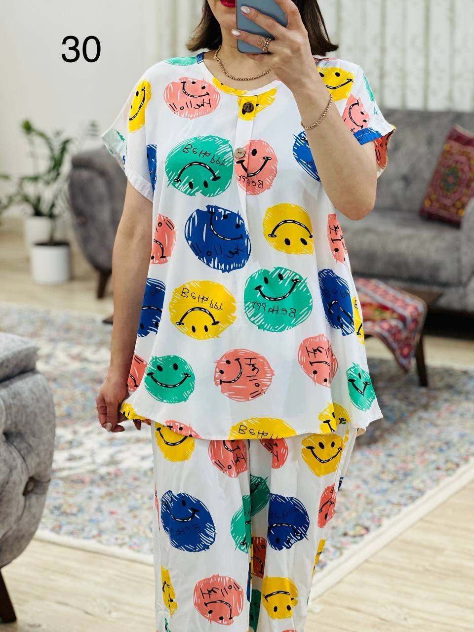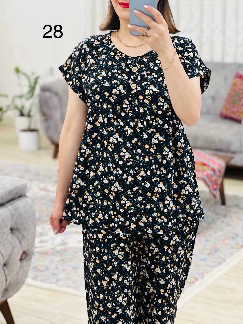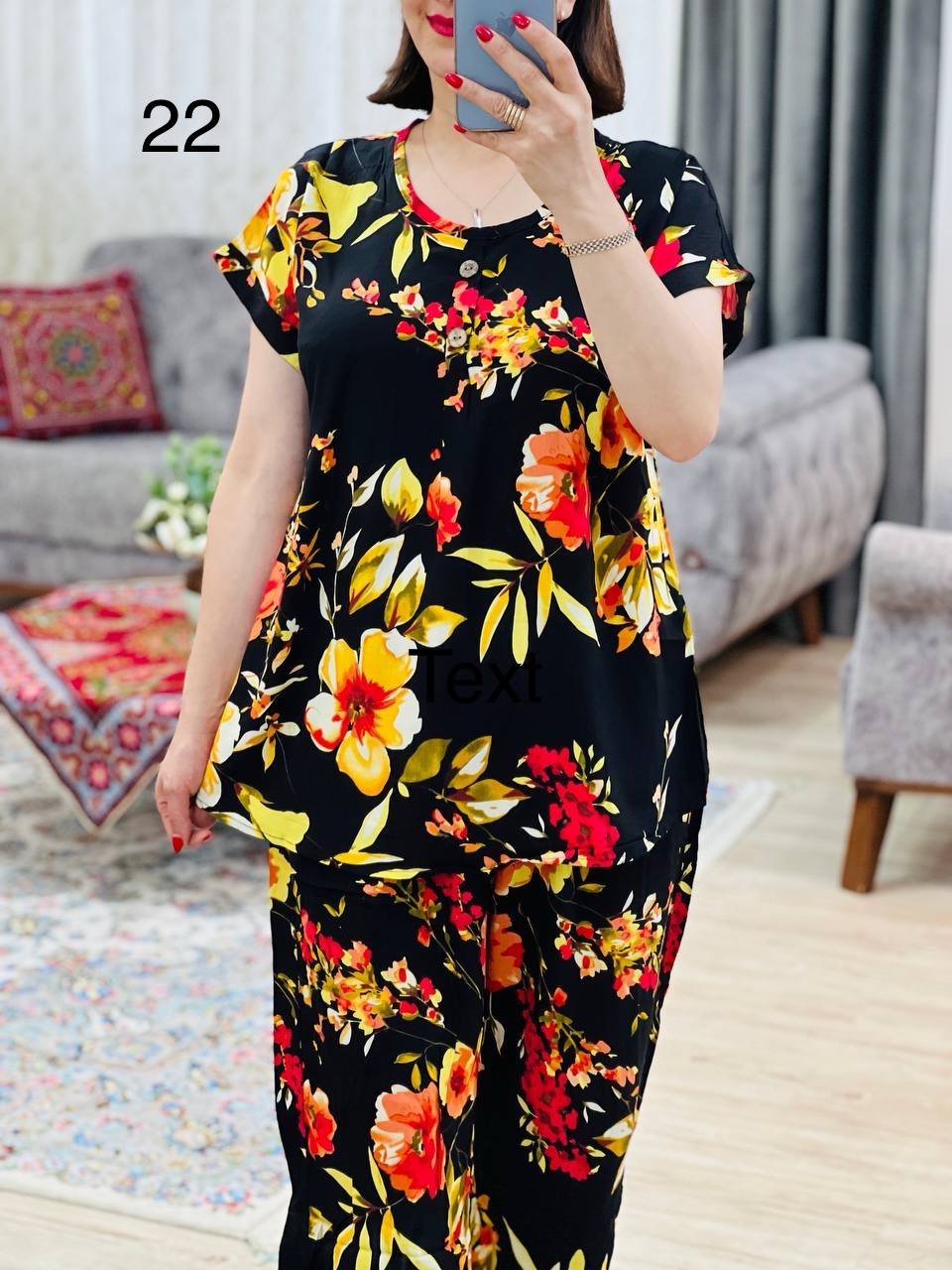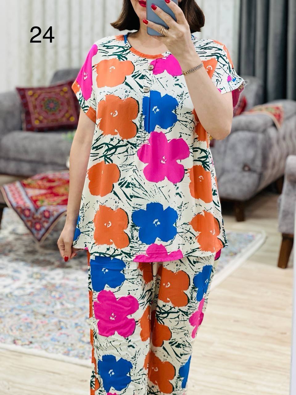 مناسب 40 تا 44 / دور سینه 120 / قد تیشرت 70 / قد آستین از یقه 23 / قد شلوار 99 / دور ران 70