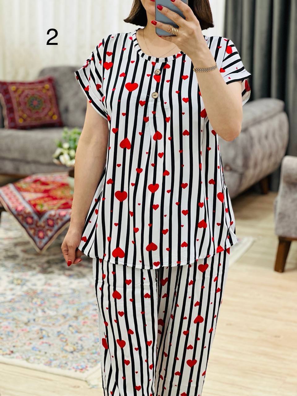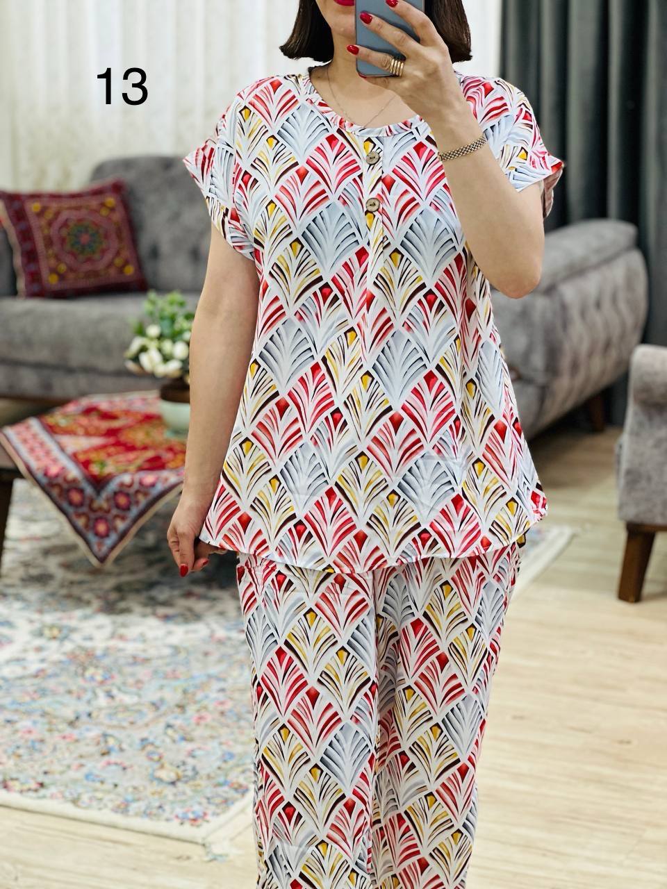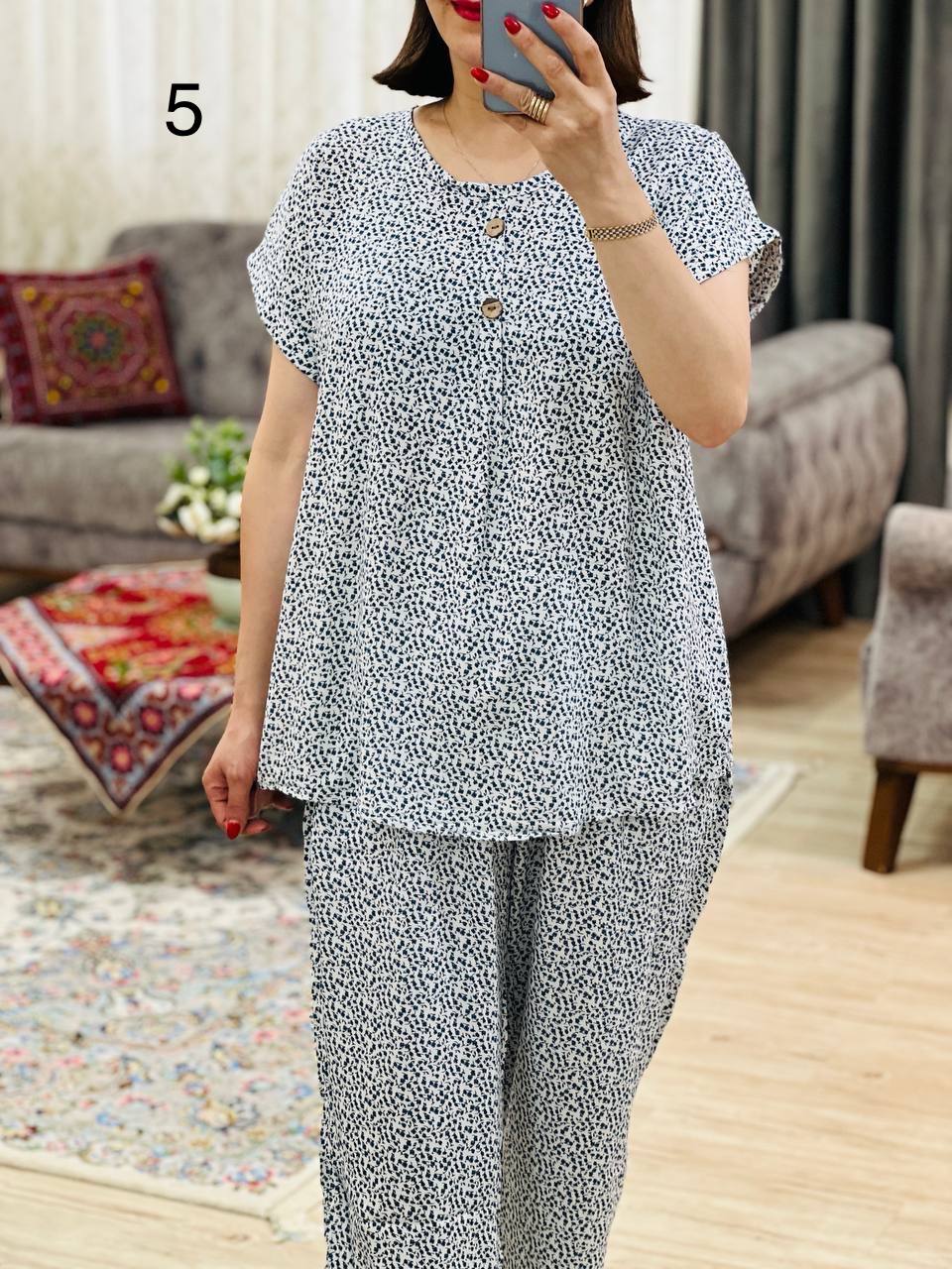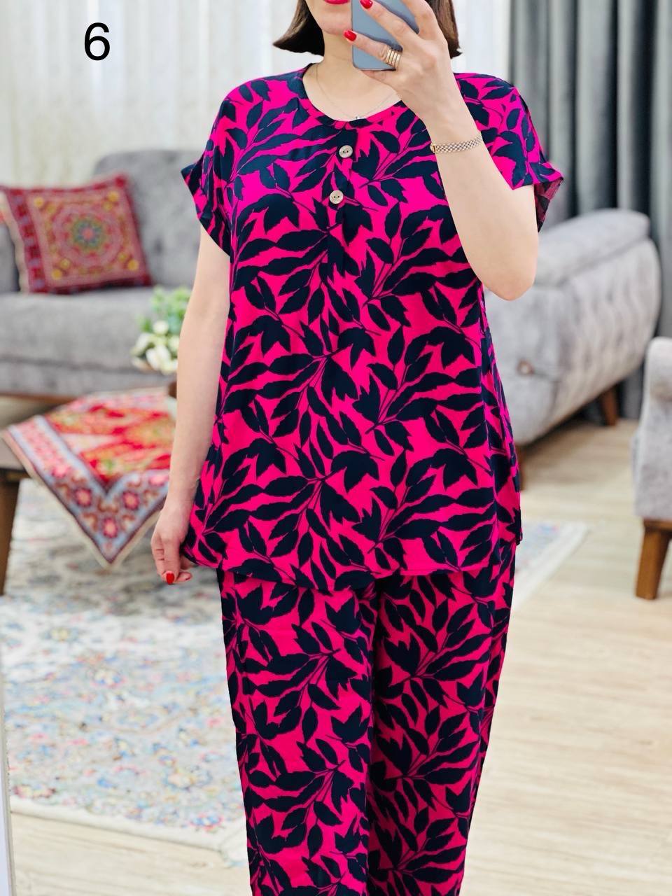 | 2 | مناسب 40 تا 44 / دور سینه 120 / قد تیشرت 70 / قد آستین از یقه 23 / قد شلوار 99 / دور ران 70 |