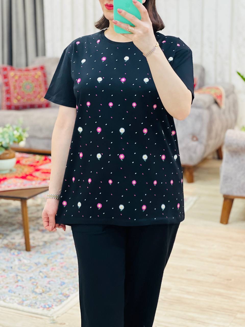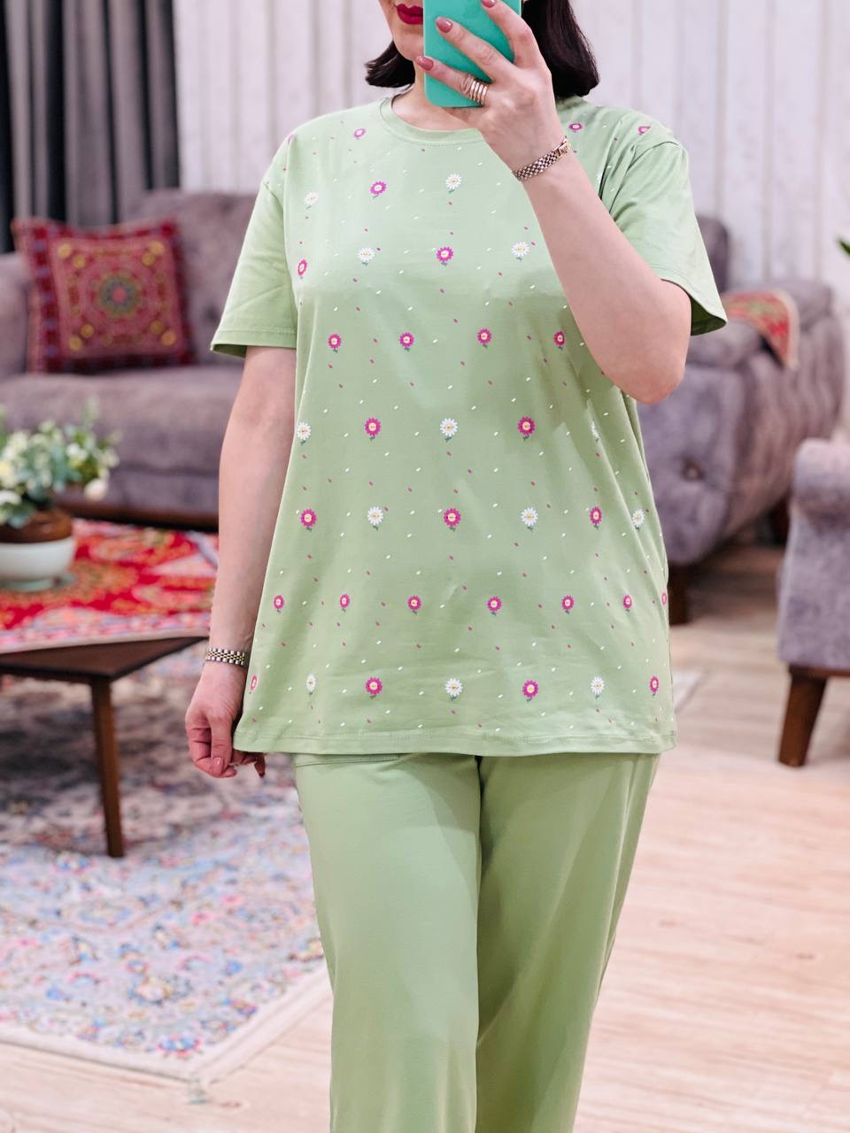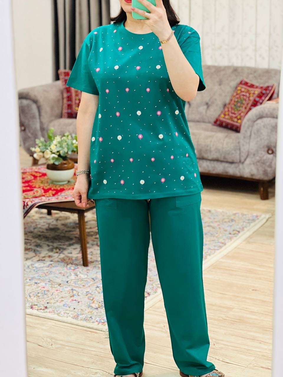 مناسب 38 تا 46 / دور سینه 110 / قد تیشرت 73 / قد آستین 24 / سرشانه 13 / قد شلوار 94 / فاق 34 / دور ران 60