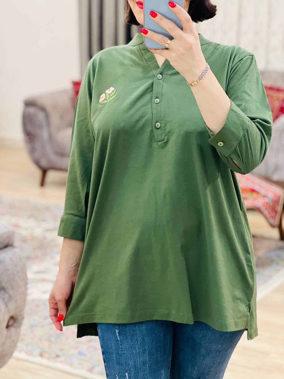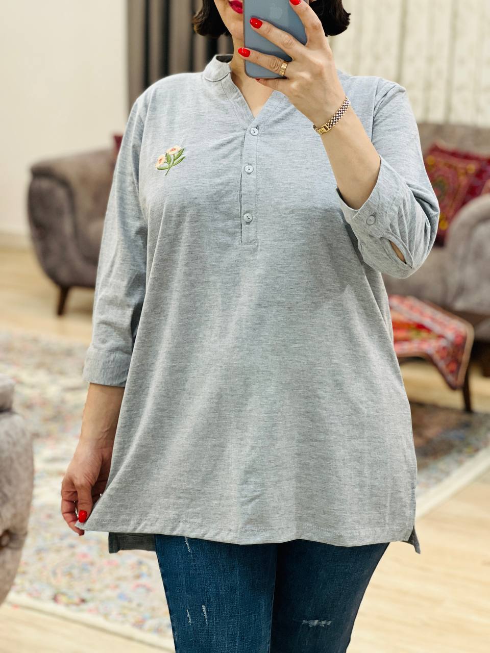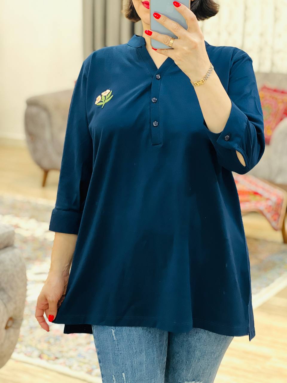 مناسب 38 تا 46 / دور سینه 114 / قد تونیک 70 / قد آستین 42 / سرشانه 14