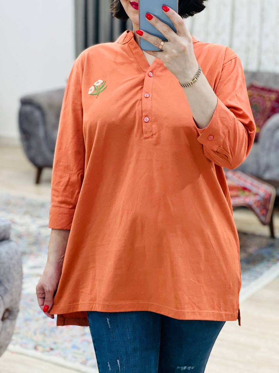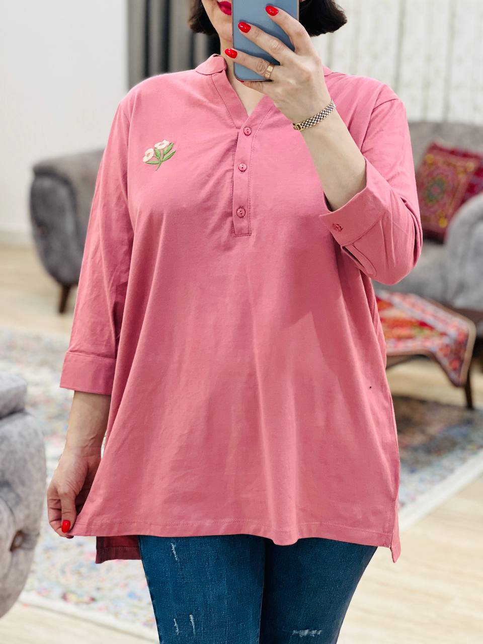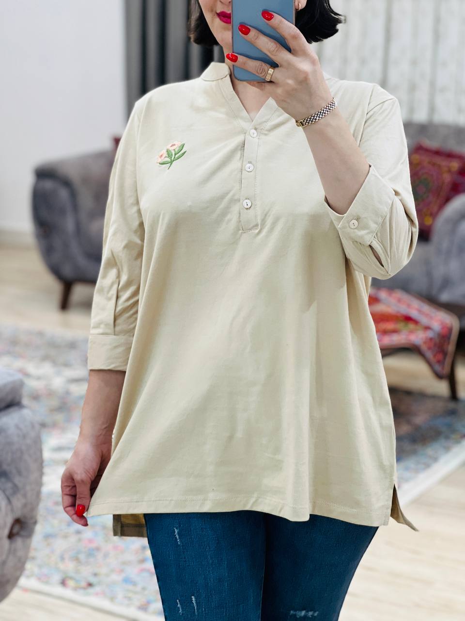 مناسب 38 تا 46 / دور سینه 114 / قد تونیک 70 / قد آستین 42 / سرشانه 14