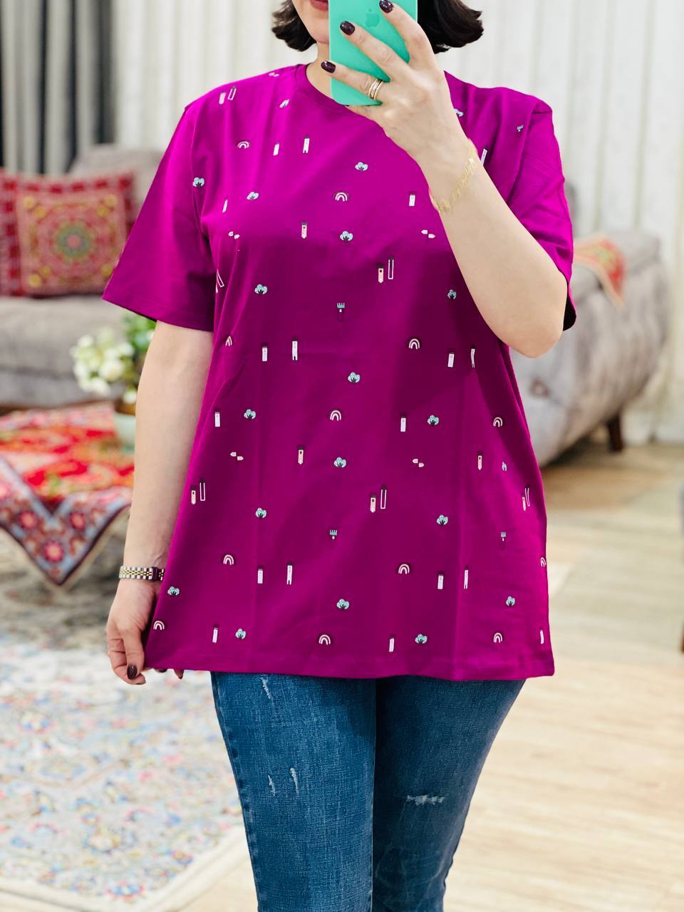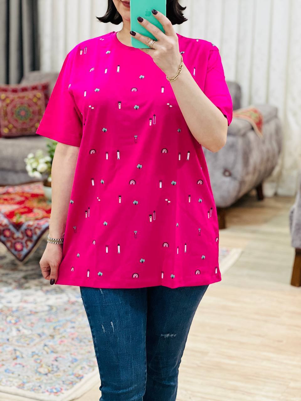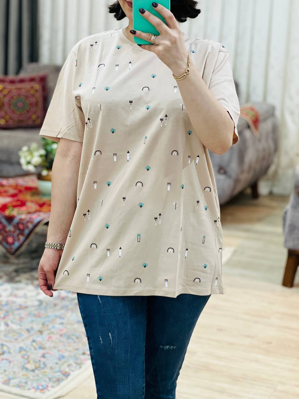 مناسب 38 تا 46 / دور سینه 110 / قد تیشرت 73 / قد آستین 24 / سرشانه 13 / دور بازو 44