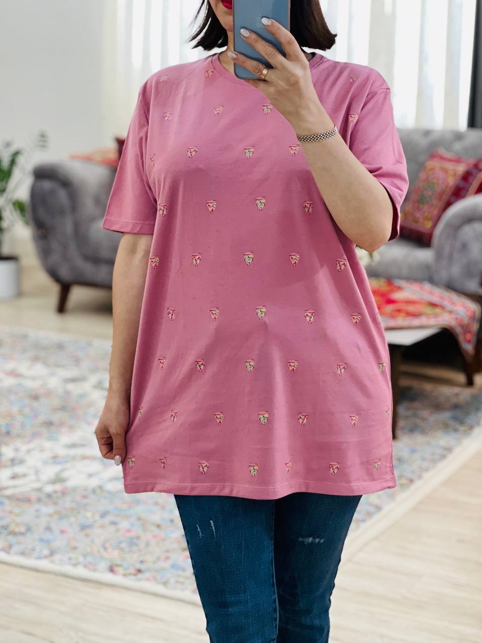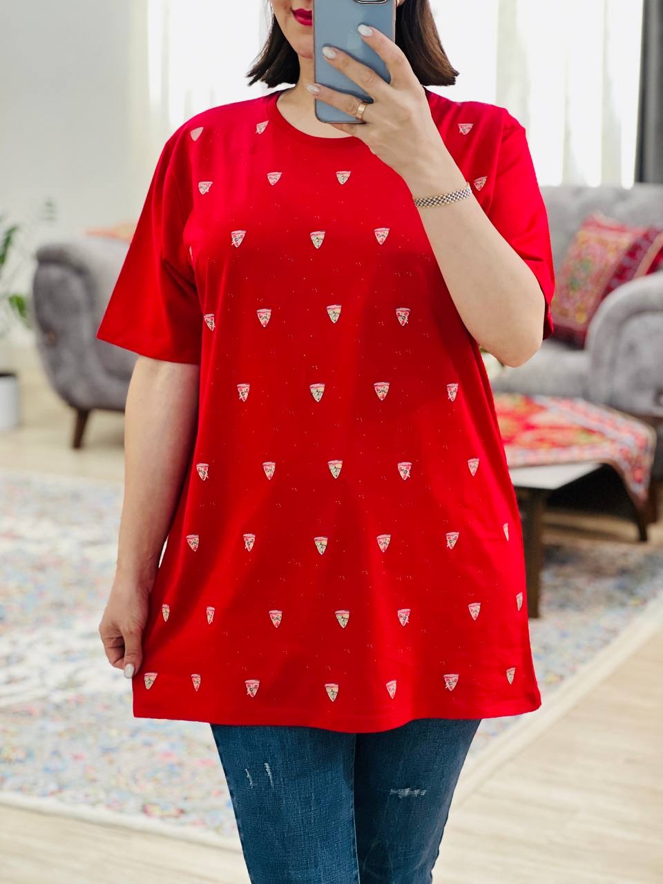مناسب 38 تا 46 / دور سینه 110 / قد تیشرت 73 / قد آستین 24 / سرشانه 13 / دور بازو 44
