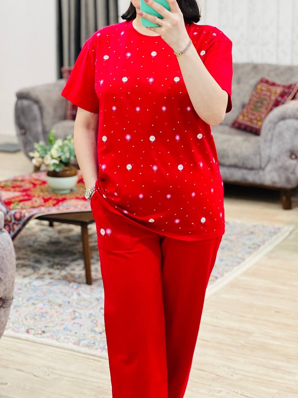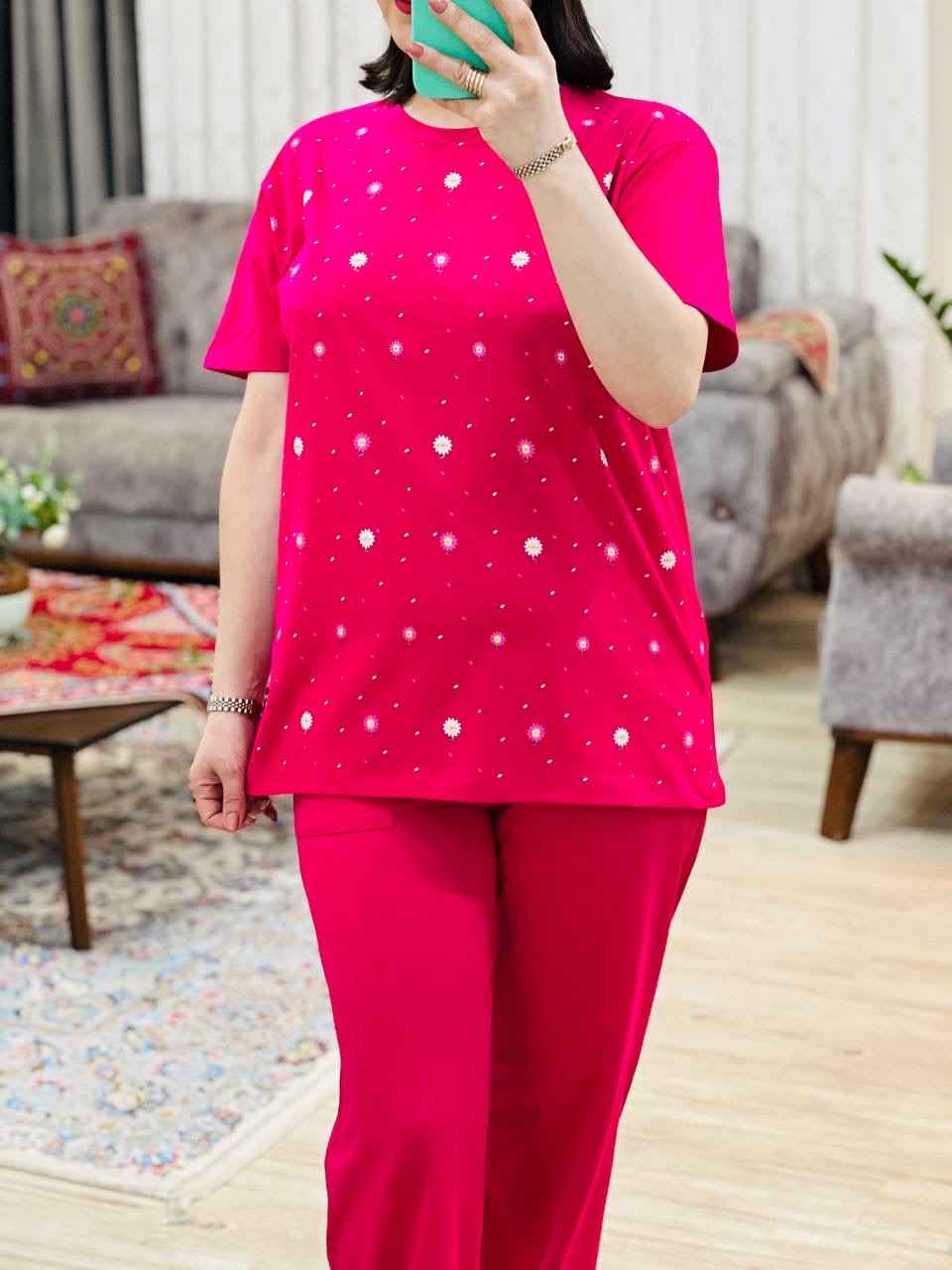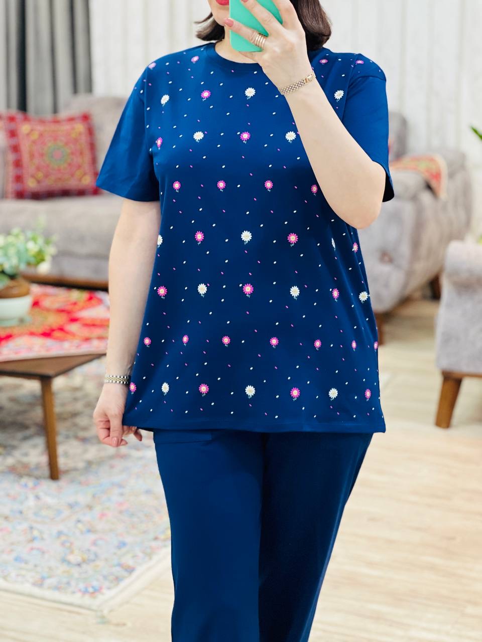 مناسب 38 تا 46 / دور سینه 110 / قد تیشرت 73 / قد آستین 24 / سرشانه 13 / قد شلوار 94 / فاق 34 / دور ران 60