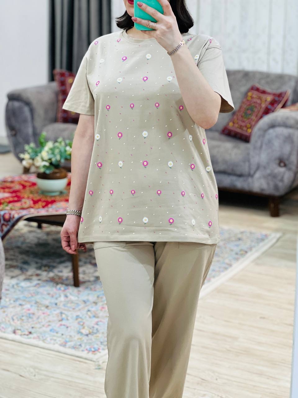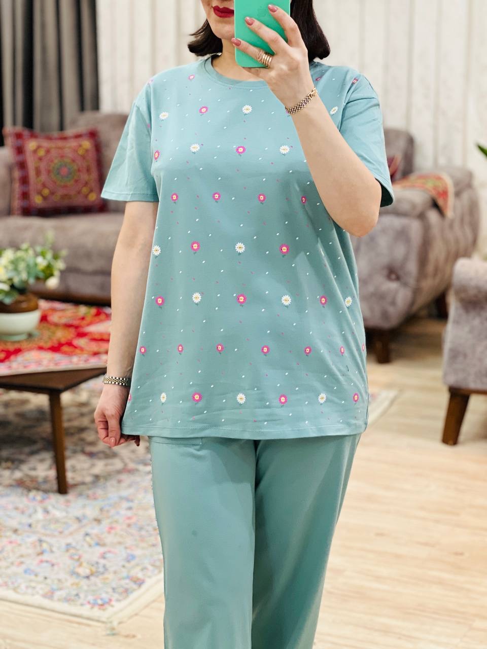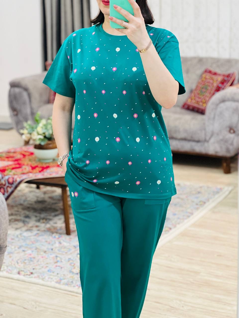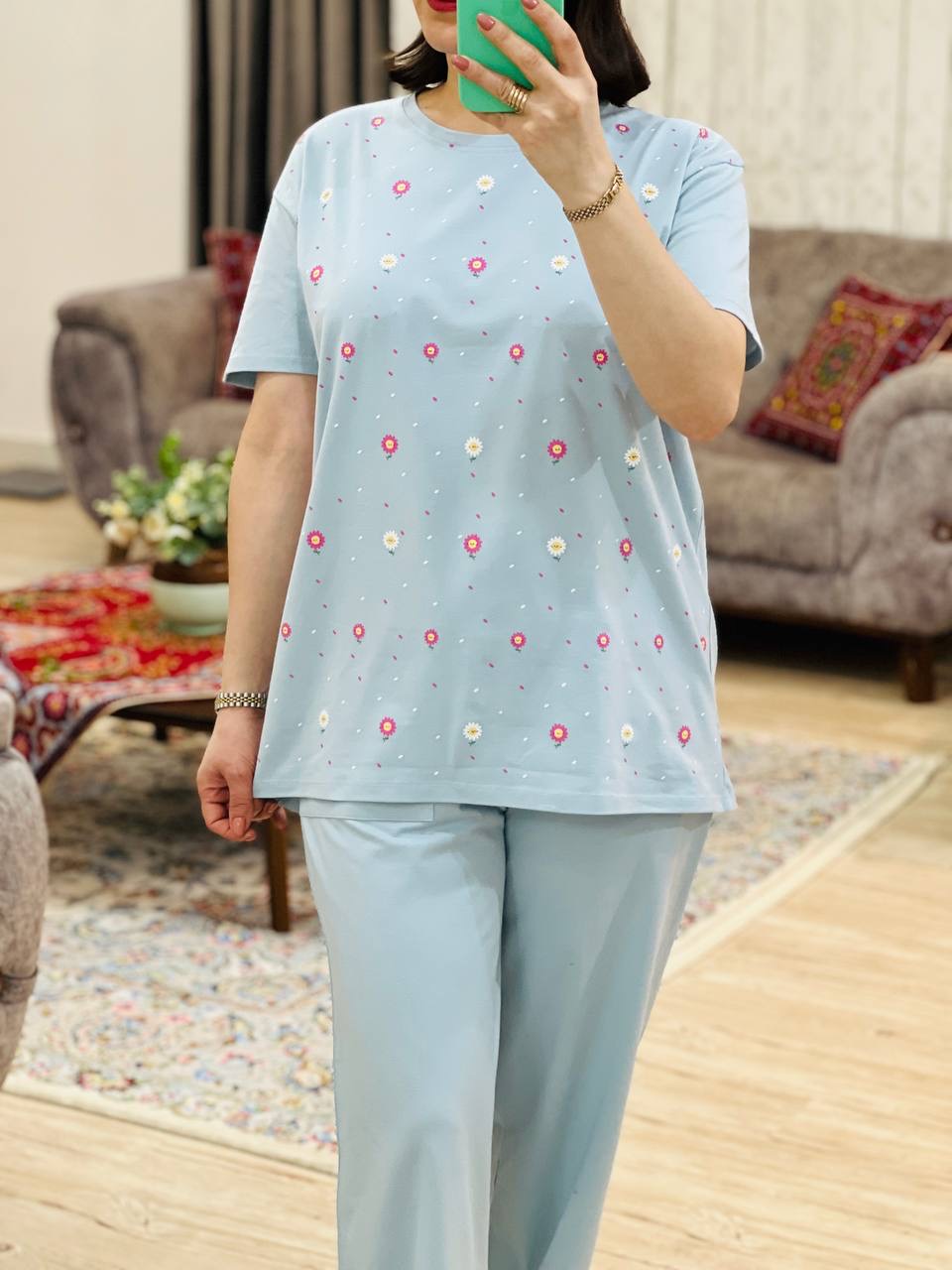 مناسب 38 تا 46 / دور سینه 110 / قد تیشرت 73 / قد آستین 24 / سرشانه 13 / قد شلوار 94 / فاق 34 / دور ران 60